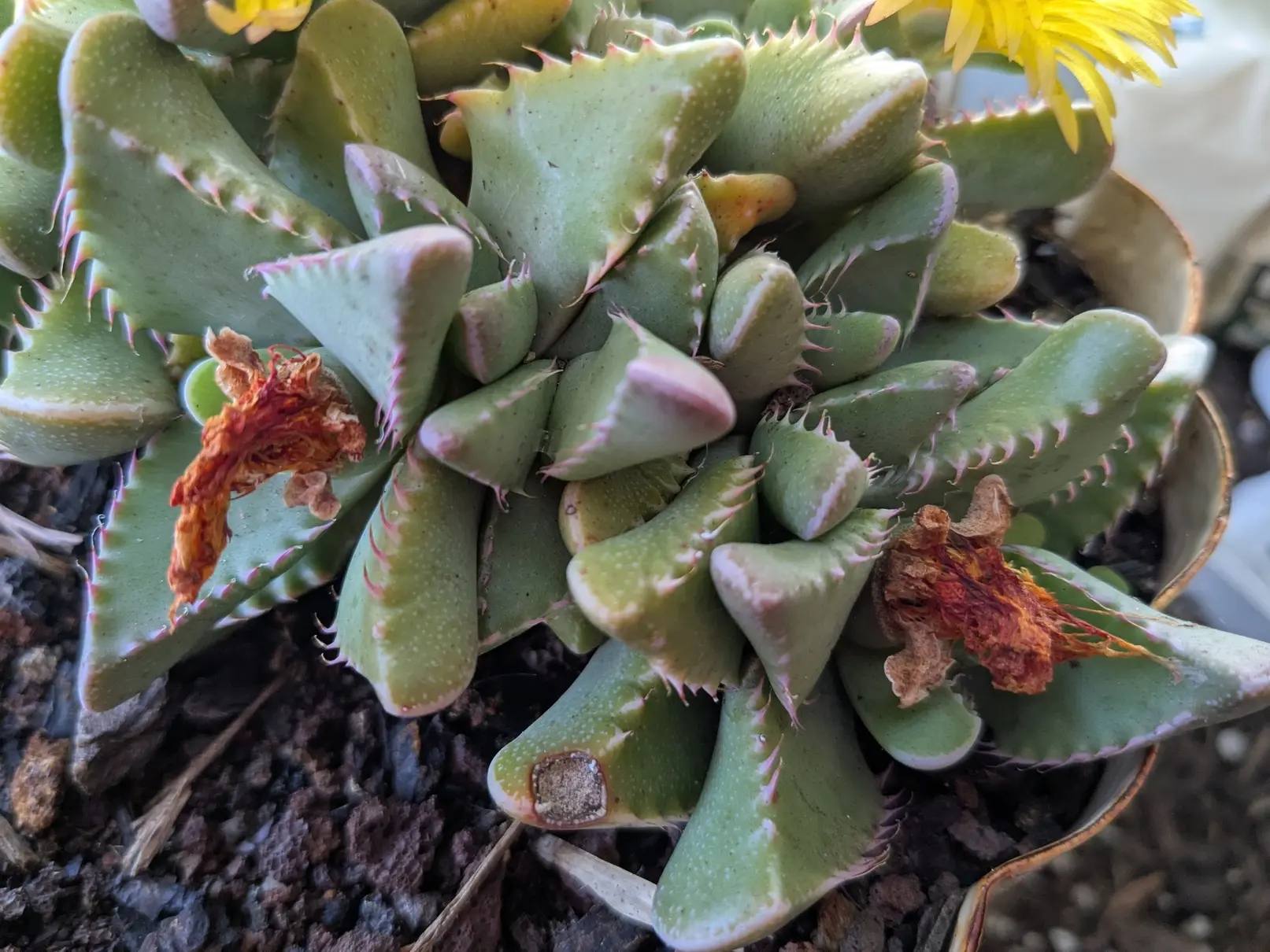 Cat Chap, Tiger Jaws, Cat Jaws, Wolf-mouth MesembDescription: Faucaria felina iss a compact leaf succulent forming unusual clumps of fleshy, boat-shaped, toothed leaves